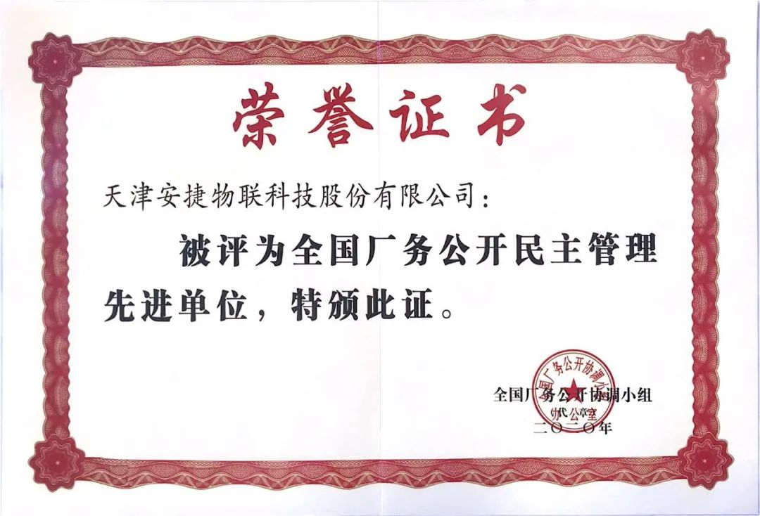 近日,天津z6.com尊龙物联科技股份有限公司被全国厂务公开协调小组授予“全国厂务公开民主管理先进单位”称号。