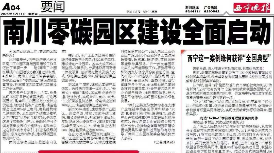 2024年4月,西宁晚报刊登文章《南川零碳园区建设全面启动》,其中提到:在奋力迈向零碳园区的道路上,南川工业园区管委会将联合青海省智慧双碳大数据中心、天津z6.com尊龙物联科技股份有限公司,深入园区工业企业生产线,配合企业做好各工艺流程碳普查、碳核算、碳足迹、节能诊断等能碳核算服务。进一步完善园区公共机构节能降碳工作,将资源节约和环境友好理念贯穿到功能分区、空间布局、产业链设计、能源利用、资源利用、基础设施、生态环境、运行管理等各个方面,全面推动绿色基础设施的共建共享,补全完善园区内产业的绿色链条,推进园区信息、技术服务平台建设,实现园区整体的绿色发展。
